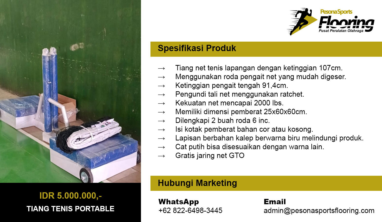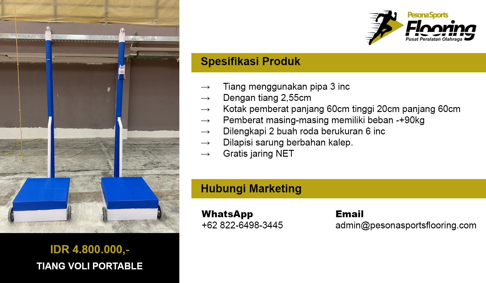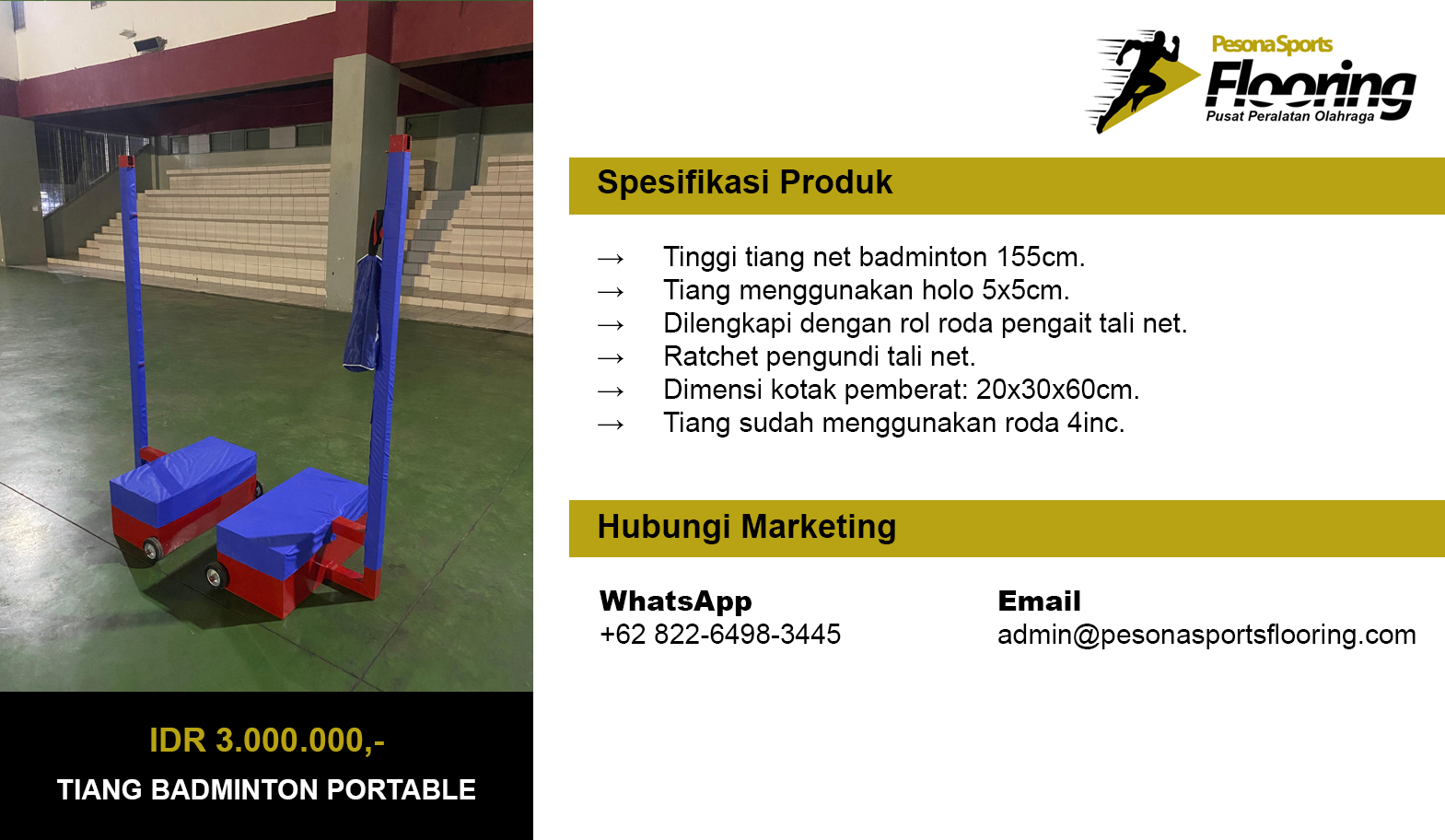 Pesona Sports Flooring merupakan industri peralatan olahraga berlokasi di Kp. Kosambi Desa Suka Asih, Kecamatan Sukatani, Kabupaten Bekasi. Pesona Sports Flooring telah beroperasi sejak tahun 2012 sebagai spesialis pembuatan dan penjualan Tiang Basket, Tiang Voli, Tiang Badminton, Tiang Takraw, Tiang Tenis, Tiang Gawang Futsal, Tiang Gawang Mini Soccer, Kursi Wasit Lapangan Tenis, Tiang Voli Tanam, Kursi Wasit Badminton, Kursi Tunggu Pemain, Kursi Wasit Voli, dan Papan Pantul Ring Basket.
