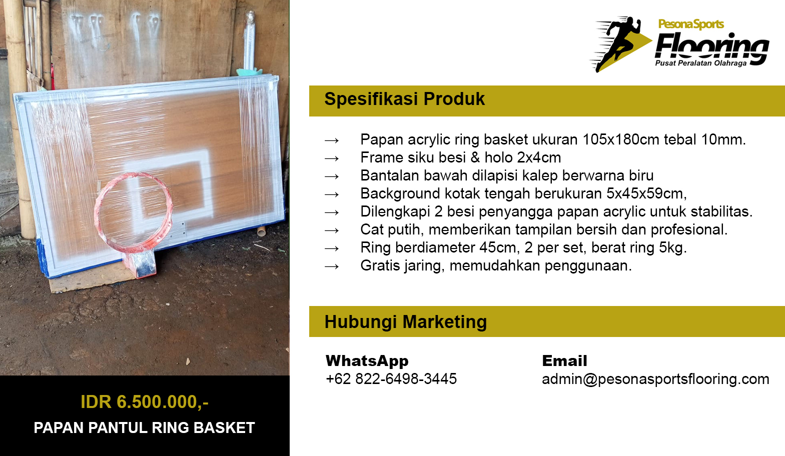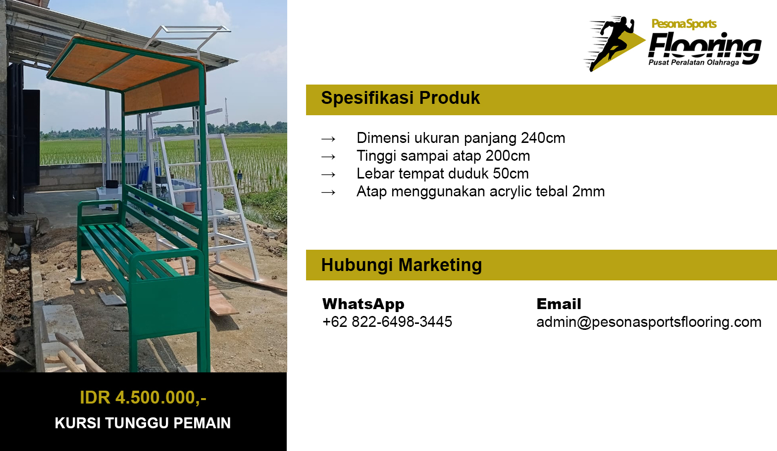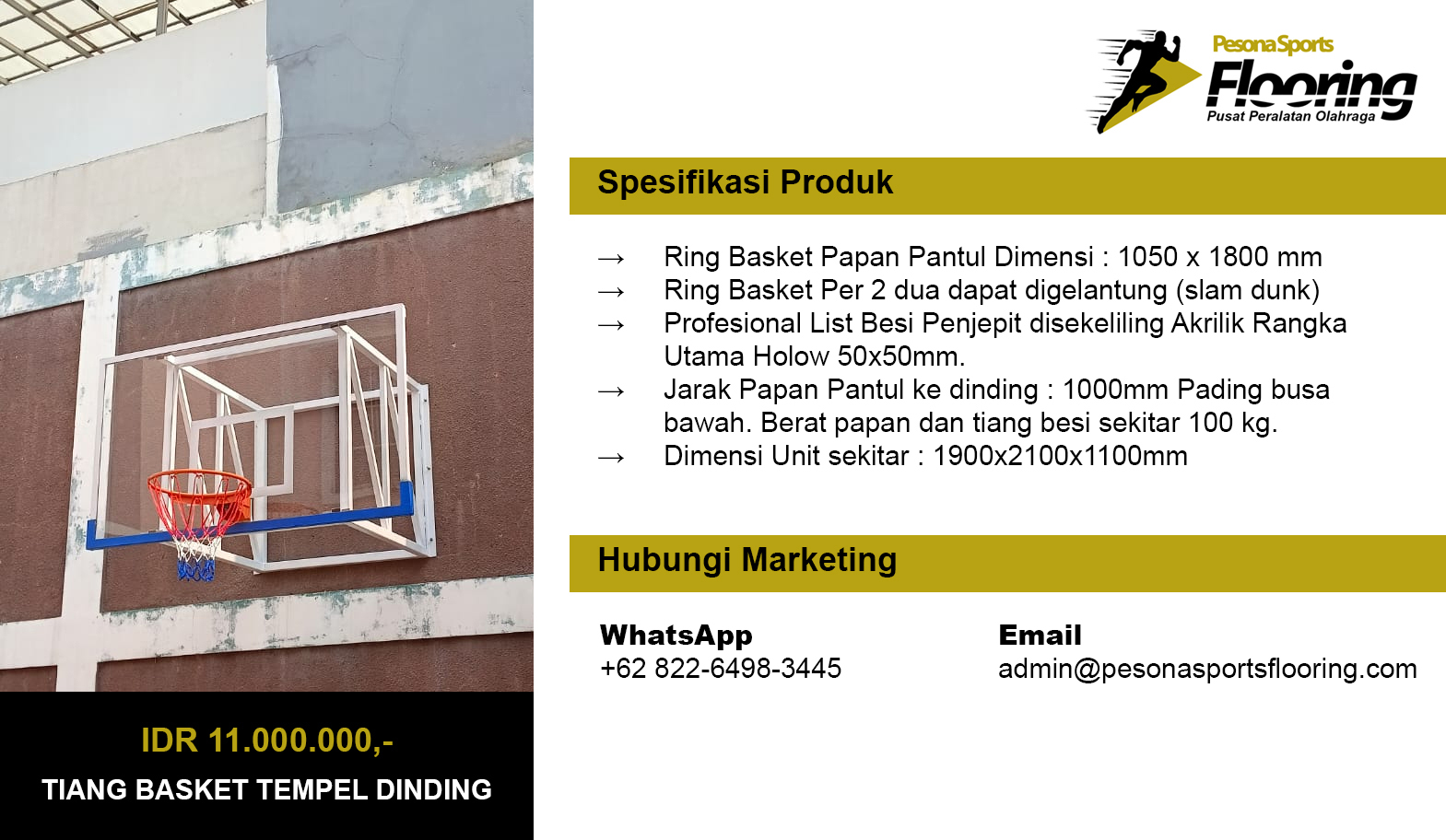 Pesona Sports Flooring merupakan industri peralatan olahraga berlokasi di Kp. Kosambi Desa Suka Asih, Kecamatan Sukatani, Kabupaten Bekasi. Pesona Sports Flooring telah beroperasi sejak tahun 2012 sebagai spesialis pembuatan dan penjualan Tiang Basket, Tiang Voli, Tiang Badminton, Tiang Takraw, Tiang Tenis, Tiang Gawang Futsal, Tiang Gawang Mini Soccer, Kursi Wasit Lapangan Tenis, Tiang Voli Tanam, Kursi Wasit Badminton, Kursi Tunggu Pemain, Kursi Wasit Voli, dan Papan Pantul Ring Basket.