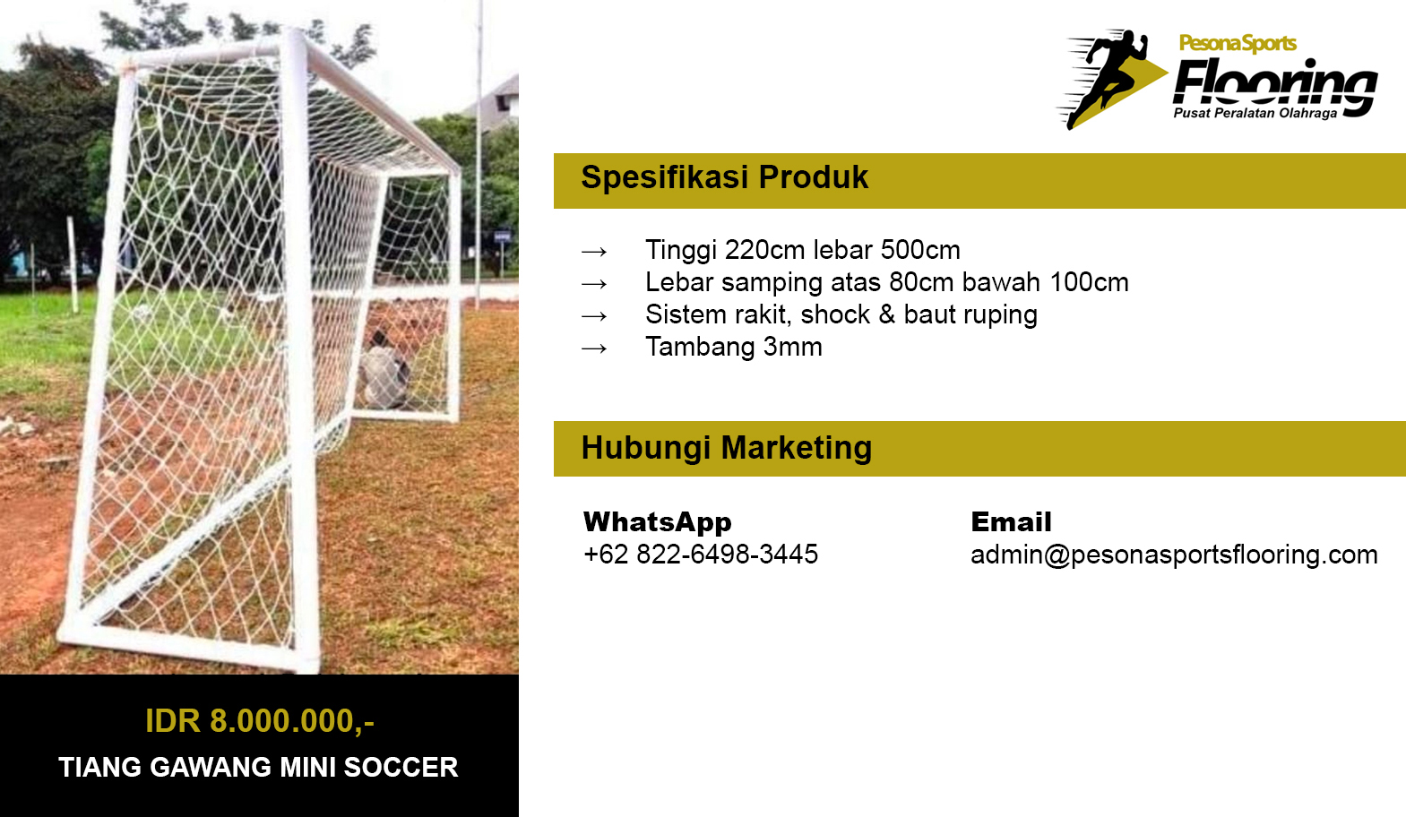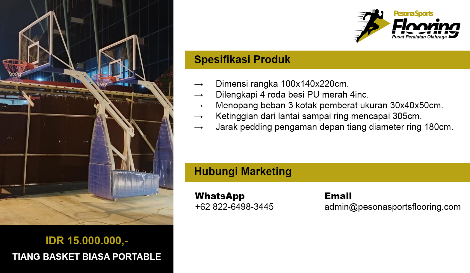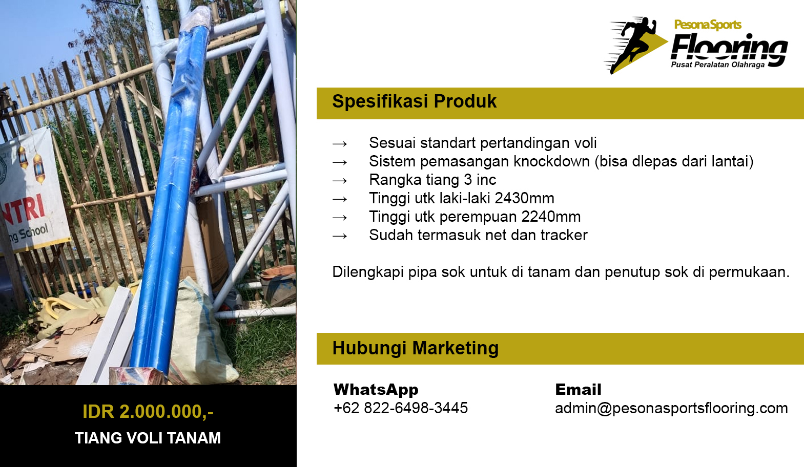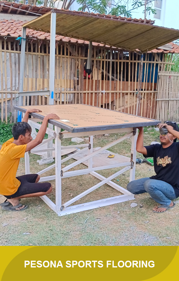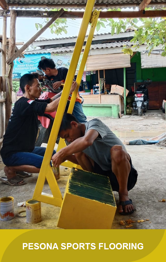 Pesona Sports Flooring merupakan industri peralatan olahraga berlokasi di Kp. Kosambi Desa Suka Asih, Kecamatan Sukatani, Kabupaten Bekasi. Pesona Sports Flooring telah beroperasi sejak tahun 2012 sebagai spesialis pembuatan dan penjualan Tiang Basket, Tiang Voli, Tiang Badminton, Tiang Takraw, Tiang Tenis, Tiang Gawang Futsal, Tiang Gawang Mini Soccer, Kursi Wasit Lapangan Tenis, Tiang Voli Tanam, Kursi Wasit Badminton, Kursi Tunggu Pemain, Kursi Wasit Voli, dan Papan Pantul Ring Basket.