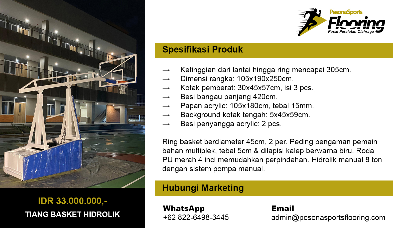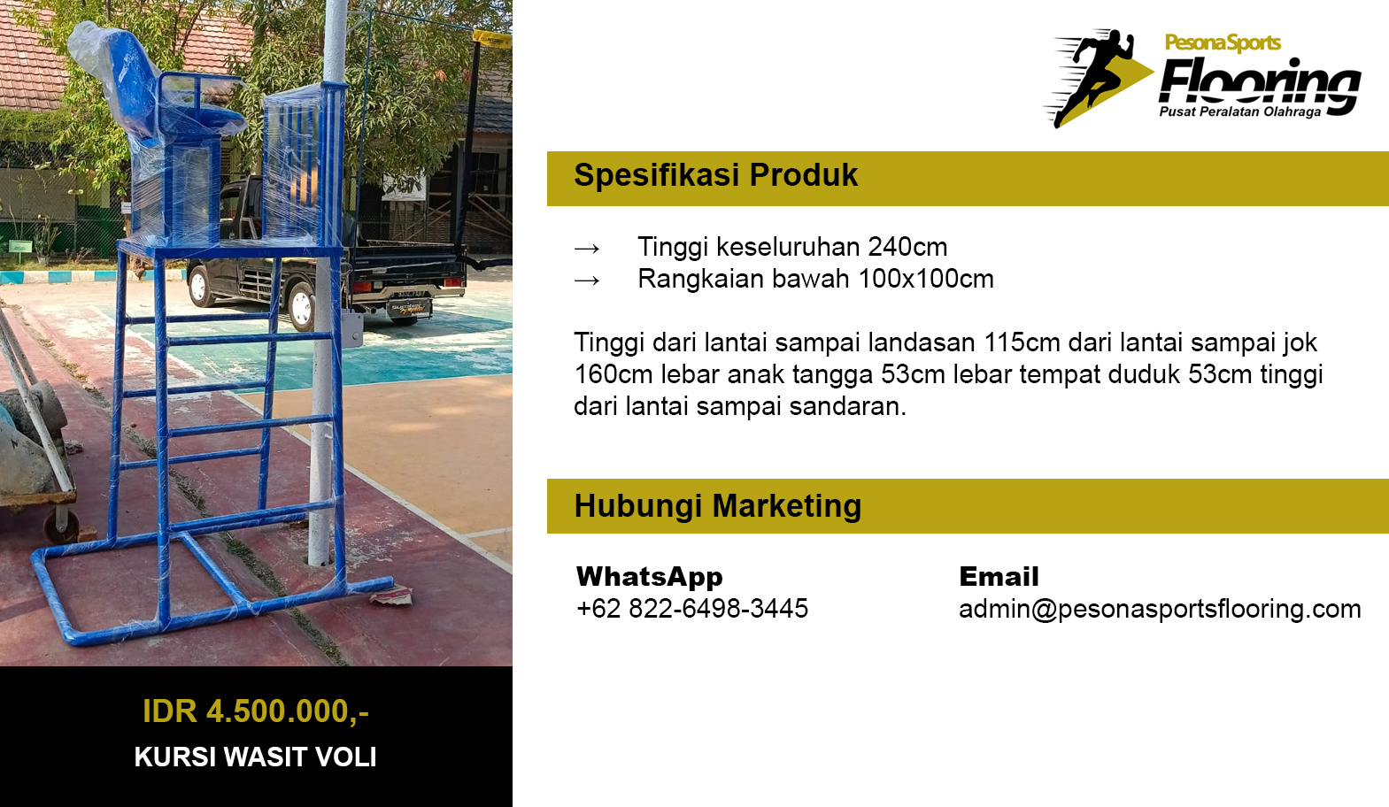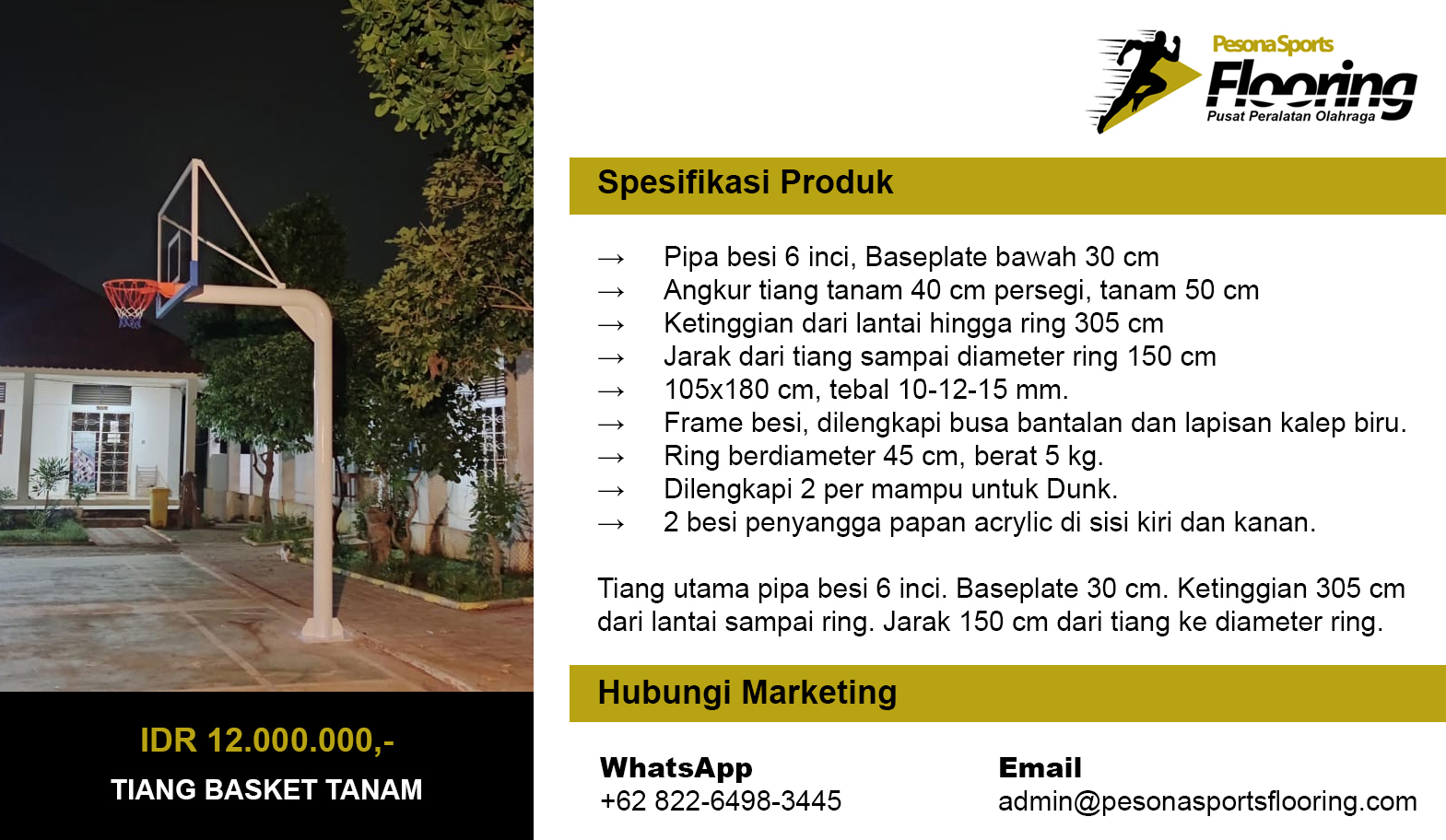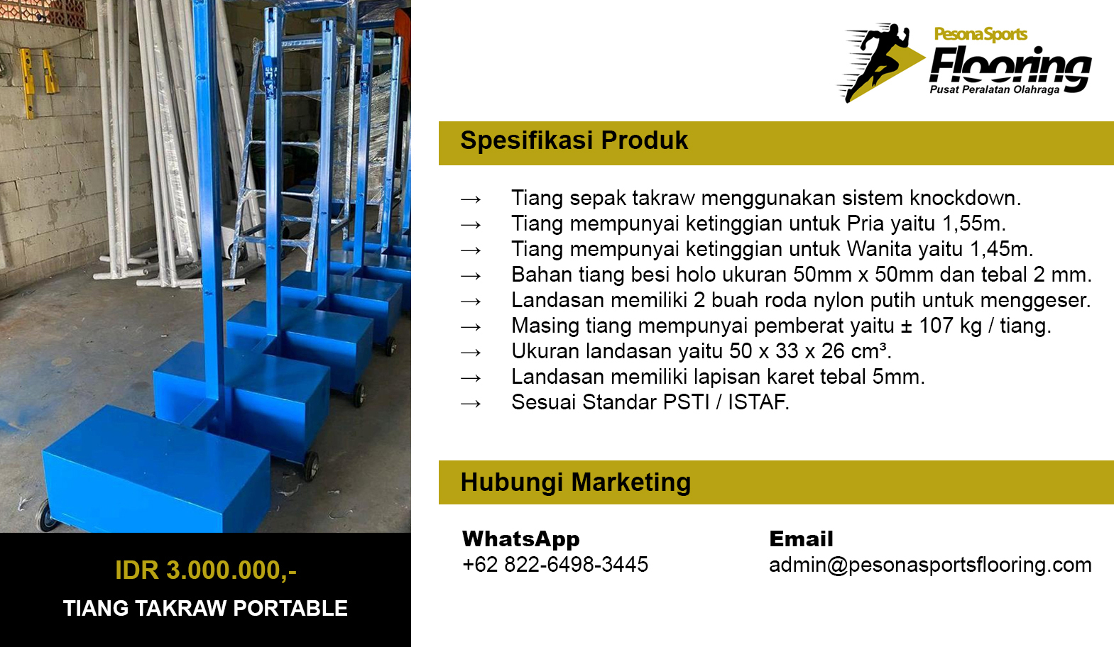 Pesona Sports Flooring merupakan industri peralatan olahraga berlokasi di Kp. Kosambi Desa Suka Asih, Kecamatan Sukatani, Kabupaten Bekasi. Pesona Sports Flooring telah beroperasi sejak tahun 2012 sebagai spesialis pembuatan dan penjualan Tiang Basket, Tiang Voli, Tiang Badminton, Tiang Takraw, Tiang Tenis, Tiang Gawang Futsal, Tiang Gawang Mini Soccer, Kursi Wasit Lapangan Tenis, Tiang Voli Tanam, Kursi Wasit Badminton, Kursi Tunggu Pemain, Kursi Wasit Voli, dan Papan Pantul Ring Basket.